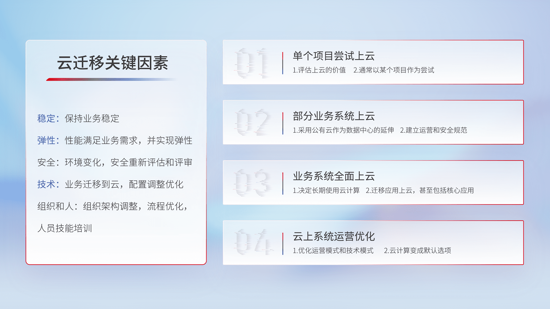 结合实际业务,,,,从规划设计、、云平台选型、、云原生改造、、、数据迁移、、、、集成交付,,,,迁移全过程为客户识别最佳上云路径,,,做好风险识别管理,,设计网络架构、、、、身份权限、、、、安全审计合规、、操作审计、、、、日志审计、、、、监控告警策略、、、、多站点容灾设计等,,对云上基础设施进行整体规划,,提升IT治理水平,,以满足弹性、、、、高可用、、、高性能的需求。。。。