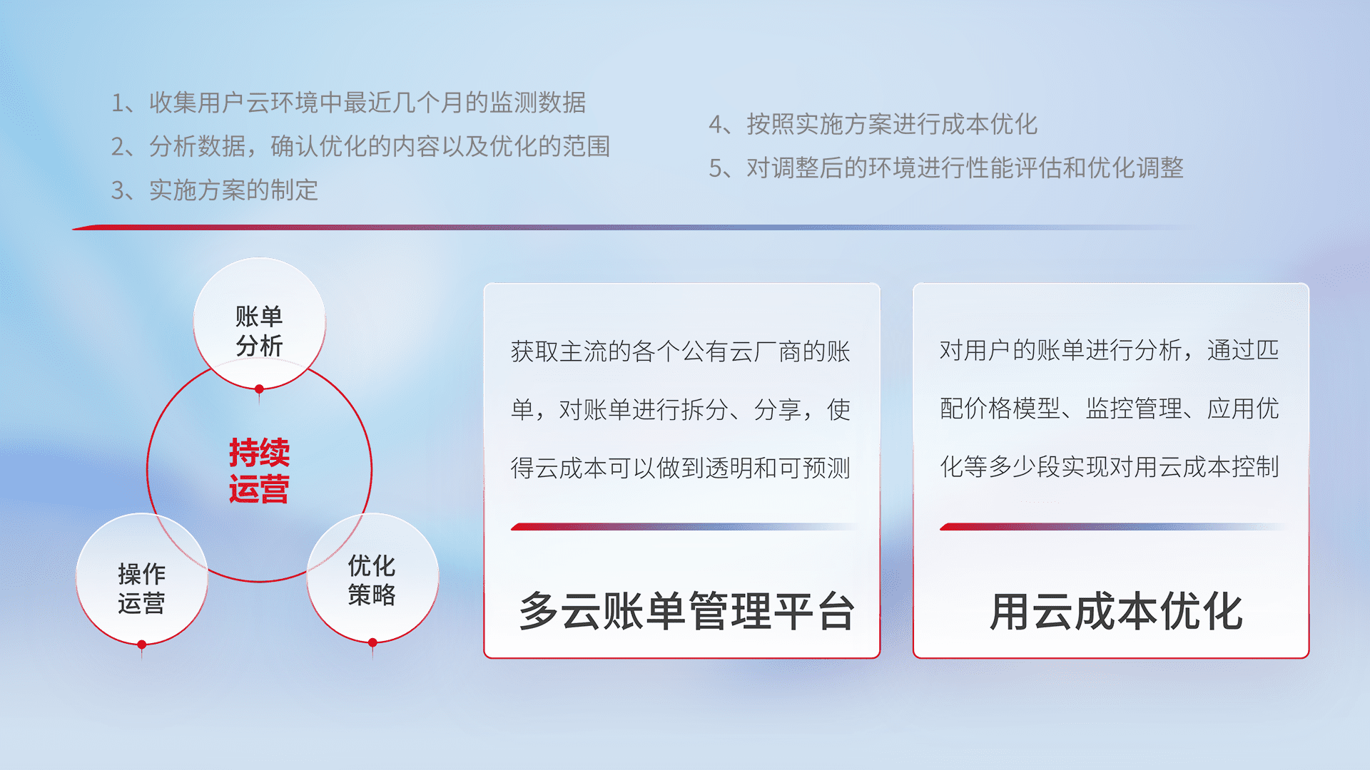 通过多云纳管,,,以统一的资源数据模型把客户的云资源进行抽象和封装,,,,进而实现对多云资源的统一操作,,,,保障云资源管理的可靠性、、、稳定性与可用性。。。。量身定制化运维内容,,,配置、、、开发运维、、补丁管理、、备份、、、、监控、、、认证和访问管理、、、审计和日常巡检等,,保障在用云过程中的可靠度,,,,稳定度以及高可用率。。。